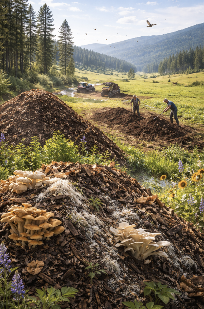 Imagine a regional system that treats so-called waste streams as feedstocks for restoration. Clean woody biomass could be chipped and blended in managed ratios with manure or other nutrient-rich organic materials. Native fungi, compost biology, and careful curing could help transform raw inputs into stable soil-building amendments. Instead of leaving piles to leach, burn, rot badly, or smolder, we could convert them into something useful: carbon, cover, moisture retention, biological life, and eventual fertility for degraded lands that need healing.